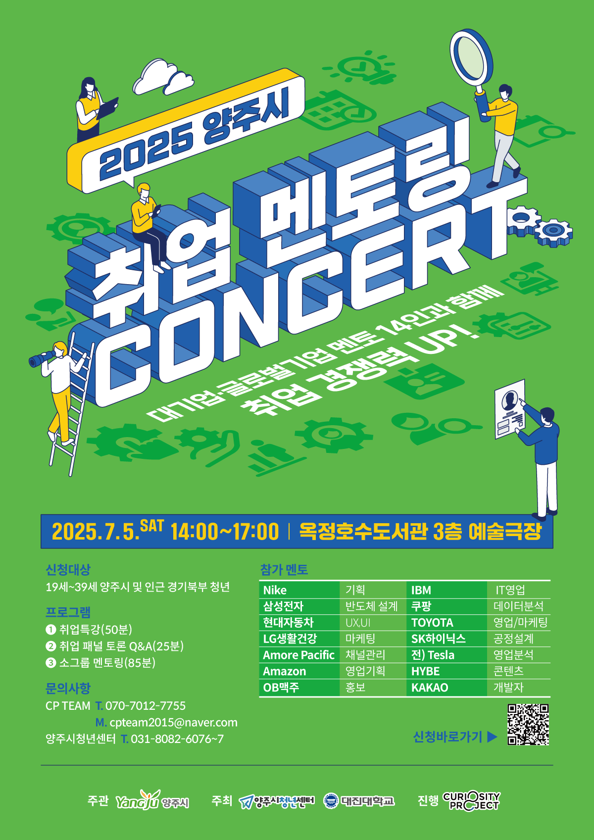 양주시에서는 구직청년들의 진로 탐색 및 취업 준비에 대한 역량을 강화하고자 「2025 취업 멘토링 콘서트」 의 참여자를 모집하고 있습니다.