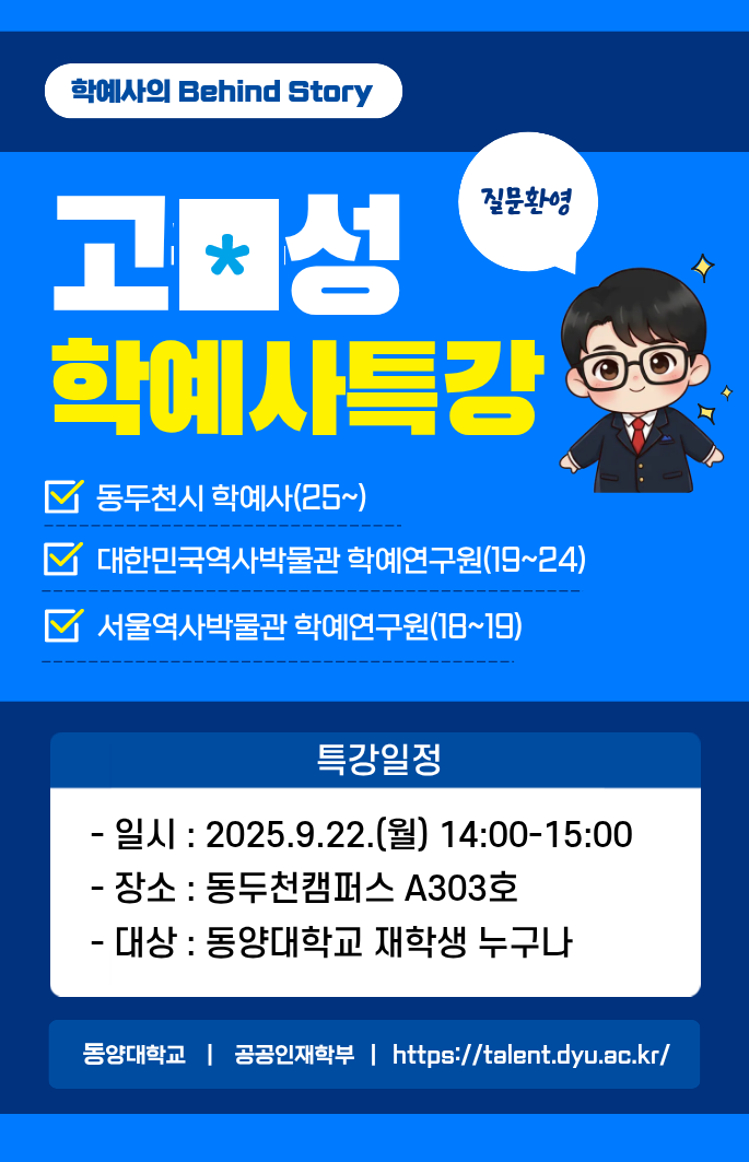 HOME > 커뮤니티 > 취업정보 및 장학금정보 커뮤니티학부 공지사항 교내 프로그램 및 공모전 취업정보 및 장학금정보 공공인재 사진첩 홍보영상 취업정보 및 장학금정보 2025-2학기 공공인재학부 전문가 특강 (동두천시 학예사) 작성자 공공인재학부 작성일 2025-09-10 14:13 조회 208 역사문화행정전공을 하여 나중에 무엇을 할 수 있을까요!? 여러 분야중에 학예사로 나아갈 수 있는 방법에 대해 알아봅시다. 많은 관심 바랍니다. 목록보기 이전 다음